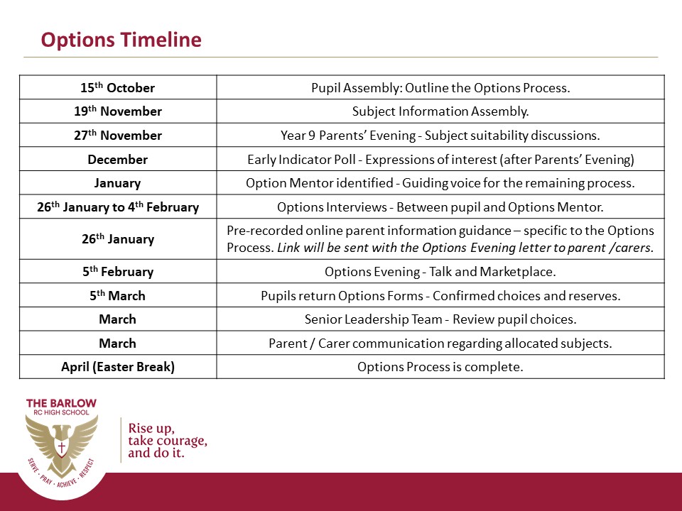 Pupils at The Barlow RC High School select their Key Stage 4 Options in Year 9. This allows pupils to secure and embed a deeper understanding of the knowledge acquired at Key Stage 3 and make informed choices about the subjects they wish to study further. As a general guide, pupils are directed to select subjects which they enjoy, are good at and which will help them secure the kind of employment they are considering in the future. Pupils are encouraged to discuss their option choices with parents and carers in addition to Curriculum Leaders, who are best placed to give subject specific advice.